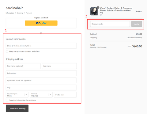 Please fill in the fields below and enter the coupon code if you have one, click Continue to shipping to complete your purchased. Pls note: One Code Can Be Used For One Order. Pls choose the best one.