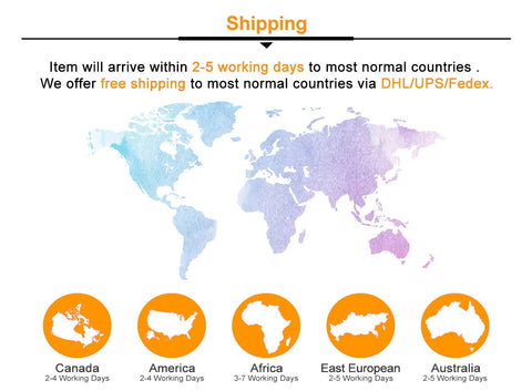 Most orders will be received in 3-5 business days, such USA, Europe, Canada. On very rare occasions, international shipping to some countries may take 5-10 days or even longer for some slow-to-ship countries such as Brazil, Mexico, and Romania. We are not responsible for any delays caused by the destination country's customs clearance processes.